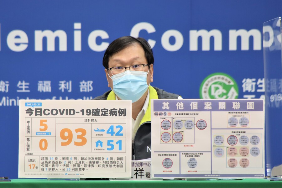 21日本土新增個案分布在南部多個縣市,包括嘉義市2例(案22040、案22041),嘉義縣1例(案22085),雲林縣1例(案22137),四案皆與嘉義婚宴群聚案有關,該群聚案目前已累積10例確診個案。此外,台南市新增一例,為先前確診個案的母親,CT值29.9,為居家隔離期滿陰轉陽的狀況。