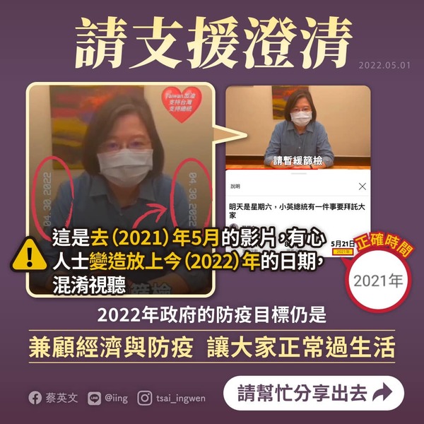 網路上最近流傳一部影片,內容為蔡英文向民眾呼籲「週末不要出門」,蔡英文1日於臉書發文澄清,這是去年錄製的防疫影片,放上今年的日期,被有心人士變造,混淆視聽,請民眾不要再轉傳影片,更請民眾「支援澄清」。