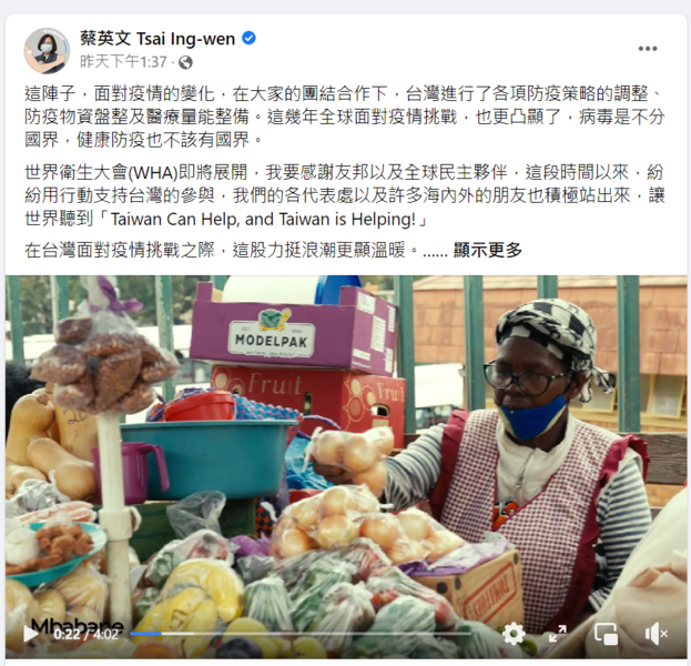 蔡英文於16日於臉書發布影片表示,世界衛生大會(WHA)即將展開,希望海內外的朋友積極站出來,讓世界聽到「Taiwan Can Help, and Taiwan is Helping!」。影片內容展現,台灣醫療人員在非洲進行醫療服務長達15年,影片受訪民眾將台灣醫生形容為「值得信賴的」、「實在的」朋友。