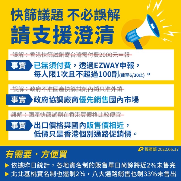 經濟部17日在臉書發文,對於4項快篩試劑相關議題做出澄清,包括快篩實名制昨天還有2%未售完,而八大通路的快篩試劑則剩下33%沒有賣出去;以及民眾可自行進口快篩試劑,目前不用專案申報費用,「有需要的朋友6月30日前,每人限1次且不超過100劑」等,請大家幫忙澄清。