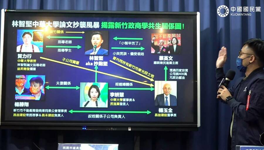 林家興補充說,林智堅論文涉及政商學的密切連結:他的指導老師賀力行是益昇開發公司獨董,益昇開發董事長楊玉全的姪媳婦是民進黨發言人李妍慧,李妍慧又是中華大學董事長,楊玉全還曾透過投資公司捐了400萬政治獻金給蔡英文總統,他希望民進黨不要再為林智堅護航。