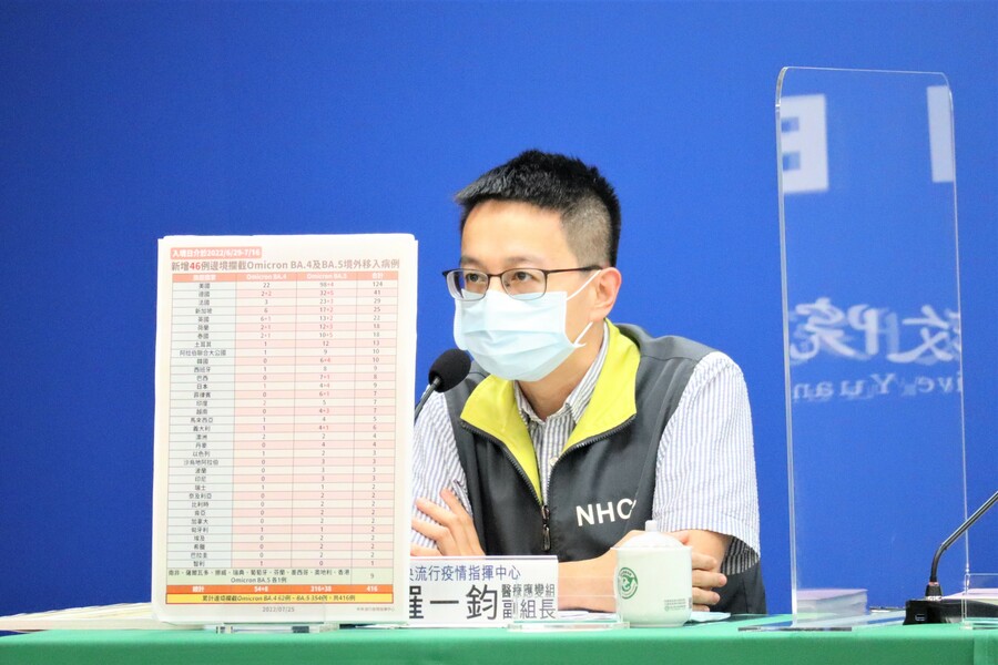 羅一鈞表示,本土新增48例BA.4及BA.5確定病例,其中46例境外移入與2例本土個案,目前共有國內共檢出416例,Omicron亞型變異株境外移入確定病例,其中BA.4為62例及BA.5為354例。他指出,「BA.5有完全取代BA.2的趨勢」,成為主流的病毒株,未來會持續觀測。