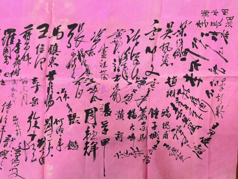 最令我驚訝的是一張上面寫滿毛筆字的粉紅緞子,這不是什麼名家墨寶,但卻比名家的更具有紀念價值。原來這是父親母親結婚時的賓客簽名。他們是於1947年在南京結的婚,算起來已經是75年前的舊物了。