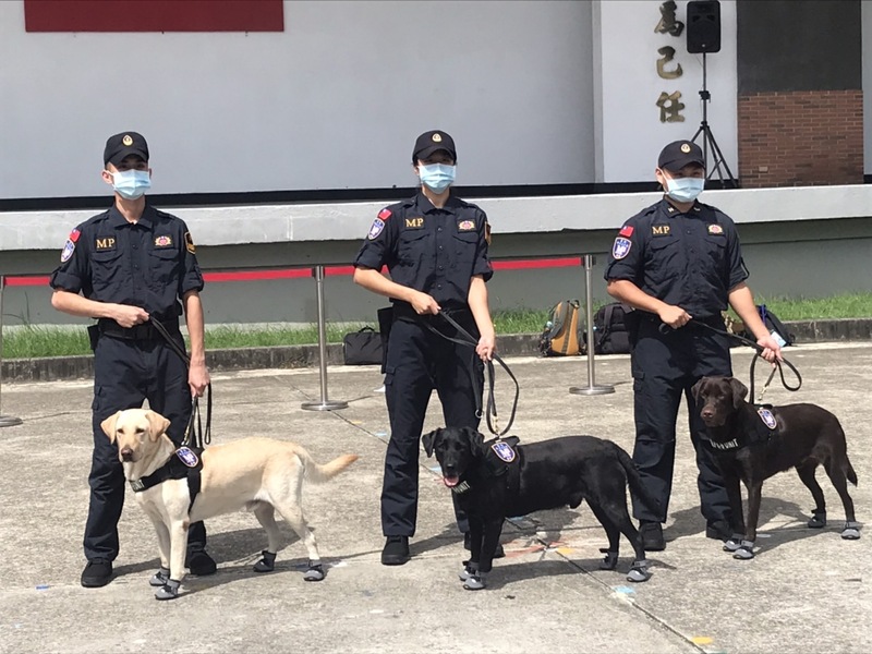 一黑、一白與一棕的拉布拉多犬是這次國軍緝毒的大功臣,狗狗們在鏡頭前坐得相當端正,顯得英姿颯爽,隨後更在領犬員的帶領下,現場展示它們專業搜尋的能力。