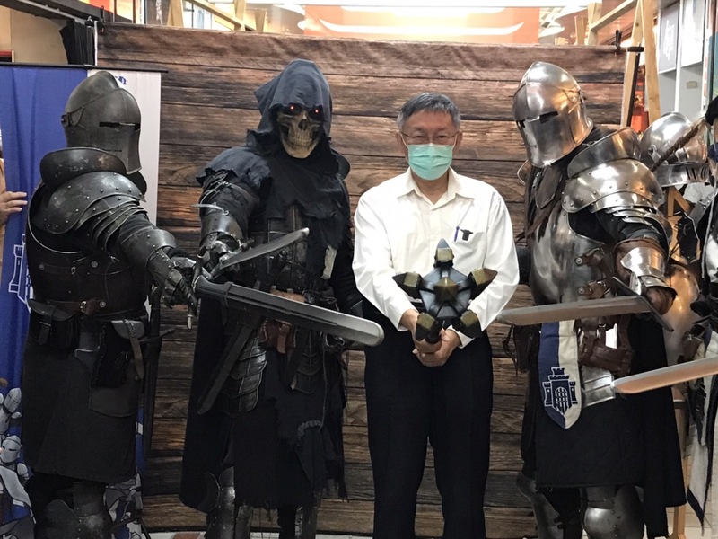 柯文哲25日也到現場探視,當逛了中世紀騎士文化的攤位時,也拿起鐵鎚,與其他扮演成騎士的民眾一同拍照,氣勢凌人。