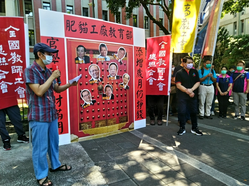 全教總、高教工會與多個教育團體在教師節這天至教育部前舉辦記者會,立起一面寫有「肥貓工廠教育部」的立牌,並點名前教育部部長吳清基、前教育部次長陳德華、吳聰明等人,高喊「退休門神肥滋滋、兼課專案慘兮兮」的口號,呼籲教育部儘速改善狀況。