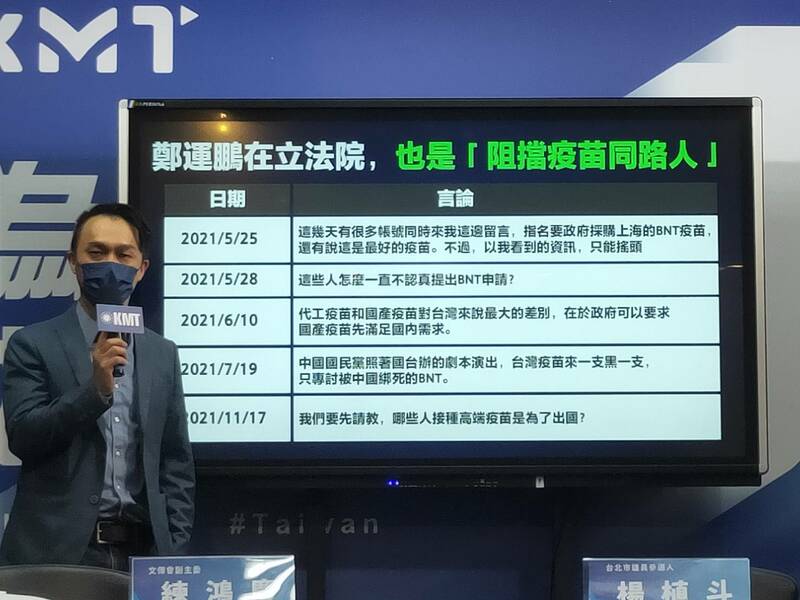 因此,他們呼籲蔡政府為阻擋BNT疫苗進口道歉。練鴻慶進一步指出,去年在BNT疫苗進口時,身為民進黨立院黨團幹部的鄭運鵬,曾多次以臉書發文,質疑國民黨要求政府買BNT疫苗是「照國台辦的劇本來演」,但後來慈濟、台積電與鴻海都有買到BNT疫苗,難道也是照著國台辦的劇本?