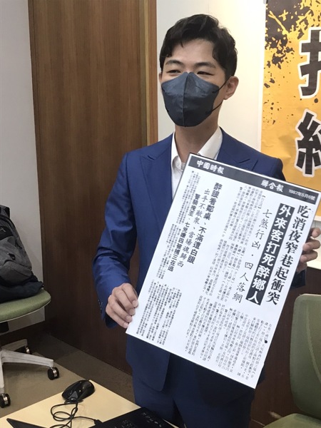 他說,鍾東錦曾於5月16日曾提到他有殺人未遂的前科,用西瓜刀劃破他人肚皮,但沒有殺人,但揚言「如果有人提出他殺人的事實,不光光有獎金10萬元,還會退選並辭去議長的職位」。