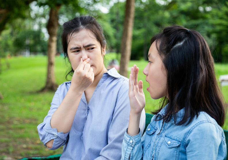 口臭常常是別人聞得到,自己聞不到。有次與一位口臭很重的人在酒會相遇,他很熱情地與我近距離談話,我因為受不了他的口臭一直向後退,但是他卻一直逼向前。最後我沒有辦法,只好將腳伸在前面,身體向後仰,以便拉大距離。
