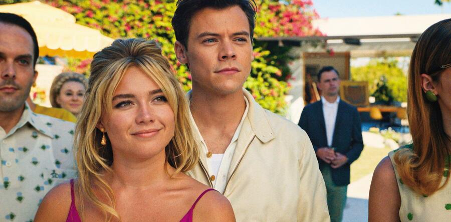 而在《別擔心,親愛的》中,地點變成沙漠中與世隔絕的富裕小鎮,鎮上的男人們正參與一項神秘不可說的大計畫,他們聽命於老閭(克里斯潘恩飾),每天一早,男人們開著高級車子,整齊畫一地出發工作,打扮美麗的妻子則在家帶孩子、操持家務,或是去老闆老婆(《永恆族》的陳靜飾)開設的健身房跳有氧、喝下午茶串門子,晚上則夜夜笙歌與行美酒美食的歡樂派對。