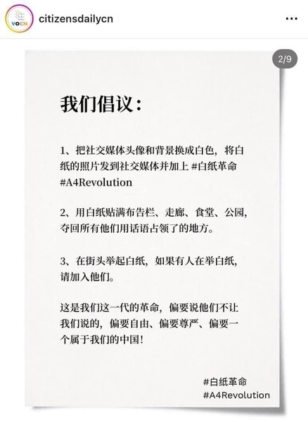 中國學生在社群媒體貼出#白紙革命倡議。(網路截圖)