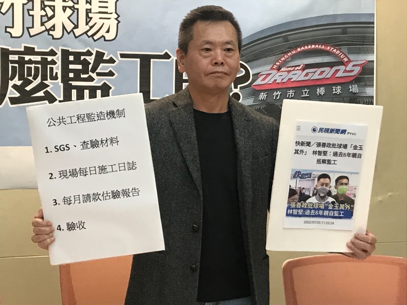 他指出,公共工程監造機制包括「查驗材料」、「現場每日施工日誌」、「每月請款估驗報告」,至少三個機制檢查現場的狀況,最後才會是「驗收」程序。林為洲強調,這些檢驗機制卻都失靈,但林智堅還曾強調,新竹球場過去8年親自監工,仍讓如此多建築廢棄物進入到球場,質問「到底在監工什麼?」