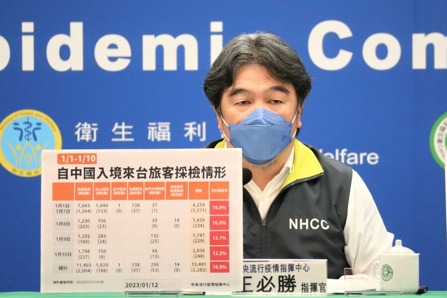 王必勝公佈自1日到10日自中國入境旅客來台的採檢狀況說,總共有13481人入境,共有2282人檢驗出陽性,陽性率高達16.9%。但他指出,目前中國入境確診監測結果,變異株檢驗結果仍是以BA.5、BF.7,「目前尚未驗出未知的變異株」。