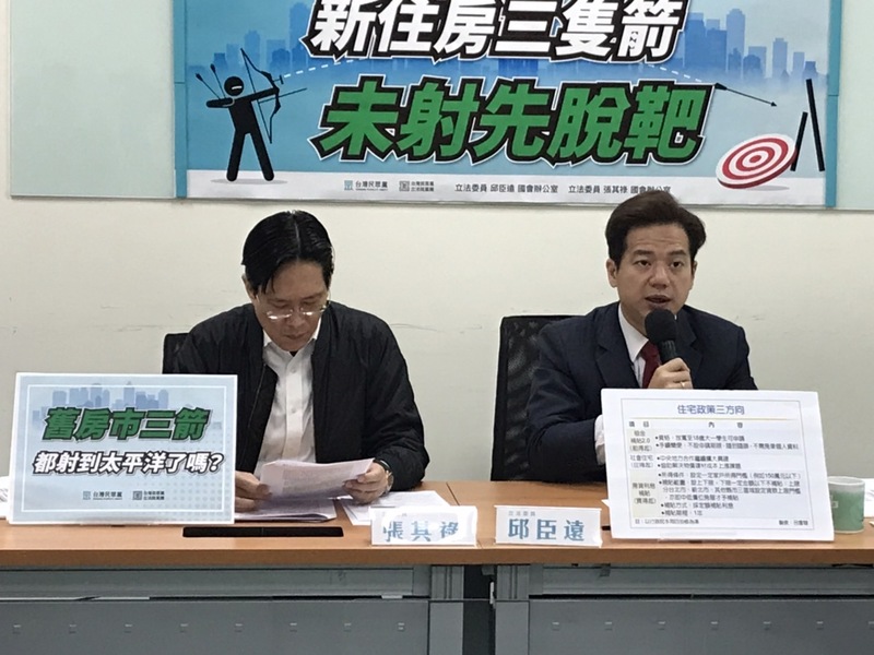 【台灣醒報記者簡嘉佑台北報導】政院又祭房市三箭,恐盲目撒幣無益房市!行政院預計於16日提出「新住宅政策三箭」,民眾黨總召邱臣遠15日召開記者會指出,房租漲幅創26年新高、房價居高不下,顯見蔡政府2016的房市三箭已落空,政策不該只是盲目補貼撒錢。立委張其祿呼籲,中央應儘快制定《平均地權條例》子法,推動囤房稅,並加速社宅建設。