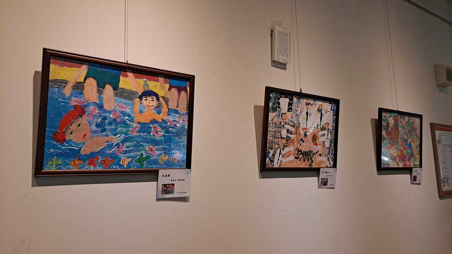 2022罕病身障者書畫創作展公益活動,畫作題材包羅萬象,貼近生活的運動場景或家庭聚會、也有小美人魚跟大恐龍,展現藝術才華。(臉書截圖)