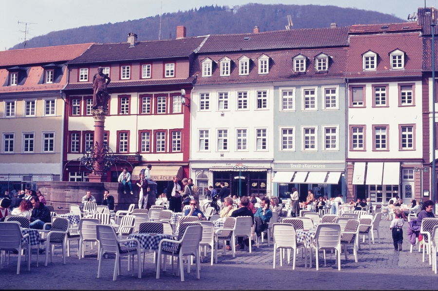 歐洲許多市中心都設有廣場,廣場上除了有雕像、噴泉、鴿子群,就是露天咖啡座,等於旅客的集散地。逛街購物累了,就可以休憩片刻,喝杯咖啡,順便上上洗手間(歐洲許多洗手間不對外開放),例如威尼斯的聖馬可廣場,露天咖啡座蔚為奇觀。我在德國海德堡市集廣場,邂逅曾經到台灣學中文的德國女孩,就在露天咖啡座聊了許久。