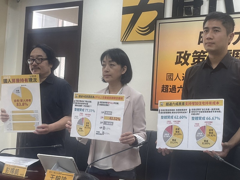 她說,時代力量也針對房地稅議題發起民調,發現逾8成國人普遍支持以空屋稅的方式,將空屋導入房屋市場,並平衡供需需求,但實際狀況是「在台灣擁有一間房屋的成本比擁有車輛還要更低」,導致擁房大戶霸佔房屋不願釋出。
