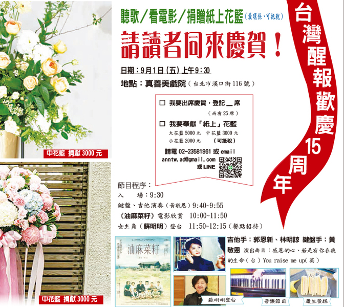 來跟我們一起看電影、聽演奏、吃蛋糕,跟醒報記者同仁、專欄作家、終身訂戶、股東支持者同樂吧! ( 詳情請見8 版公告), 訂位/ 支持 電話02-23581961 捐款成為醒報天使 由於熱心人與支持者的捐款,醒報的深度報導與客觀評論都是免費閱讀的,希望你也能加入「醒報天使」的行列,小額支持。我們會寄給您抵稅收據! 相關新聞 請病假不該被刁難勞團盼保障15天 上帝差遣耶穌來世界(2025年九月十七日╱每日甘泉) 盼新年大和解藍將參加總統府元旦升旗
