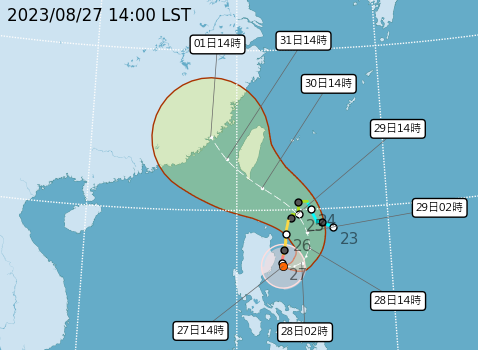 中央氣象局指出,9月1日颱風會逐漸遠離台灣,但全台都受到外圍環流影響,各地仍有局部短暫陣雨。他指出,27日下午東半部、恆春半島或基隆北海岸都已經出現長浪的狀況,隨著颱風接近,連南部海域或離島地區都會長浪,要提高警覺。