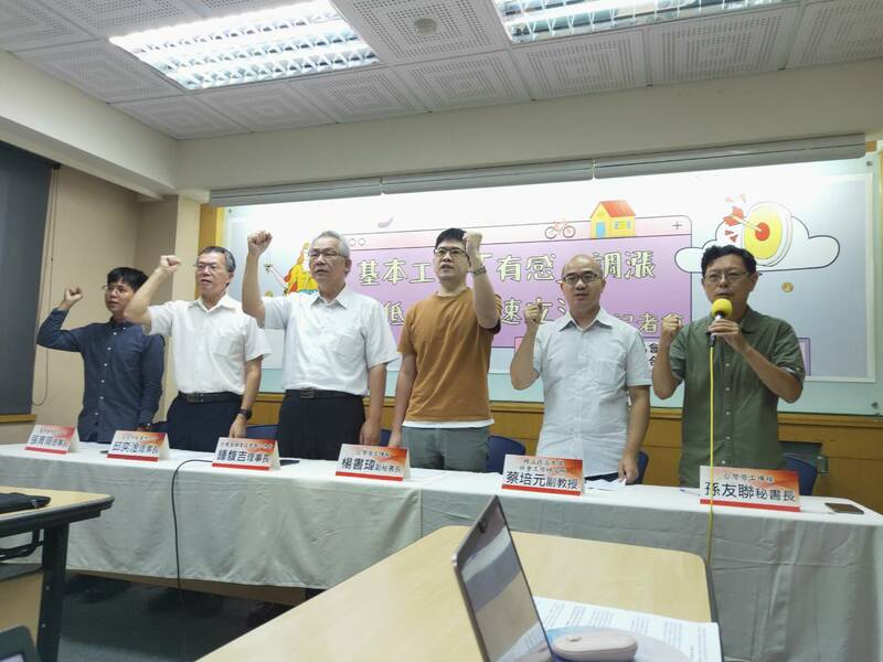 【台灣醒報記者呂翔禾台北報導】「調漲最低工資應該有法源依據,應儘速制定《最低工資法》!」勞團4日召開記者會,呼籲政府應儘速制定《最低工資法》。台灣勞工陣線副秘書長楊書瑋表示,台灣民生物資大漲,透過委員會協商漲幅並不夠,應該依據民生物價通膨等指標,制定《最低工資法》調整基本工資,符合社會觀感。
