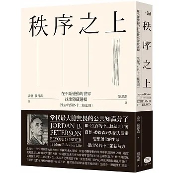 在《生存的十二條法則》中,作者試圖為價值混亂的當代生活開出解方、找出秩序。在《秩序之上》裡,他則進一步以混亂為主題,為甫經歷過全球疫情的我們指出秩序與混亂如何互為雙生,缺一不可。生命有一部分很重要的意義來自於探索未知領域,並在不斷變動的世界中找到適應之道。