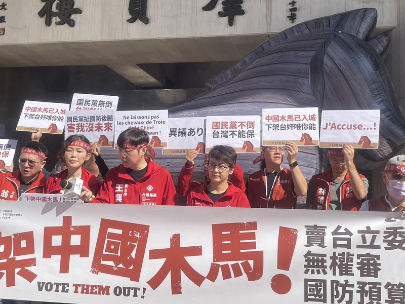 外交及國防委員會25日於立院審查113年度中央政府總預算案。台灣基進黨提早在日於立法院門口抗議,並搬出一樓高的充氣木馬,指控認同中國的立委,就宛如台灣的「特洛伊木馬」有害於國家民主,更無權審查台灣國防的預算。