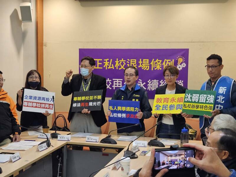 【台灣醒報記者呂翔禾台北報導】「有些私校有企業願意承接辦學,但教育部仍強制其退場,恐損害教師與學生權益!」教團14日召開記者會,呼籲修改《私校退場條例》,增加私校再生機制,避免強制退場。新北市教育產業工會理事長吳添寶說,教育部在私校退場時,讓學生必須強制轉學,也不願處理私校教師就業問題,《退場條例》都應儘速檢討。