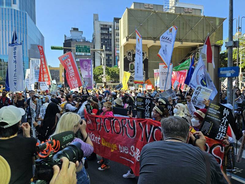喊完口號後,數百名移工與勞團便從中華路一段的直聘中心出發,一路經過漢口街、館前路、北車西門(承德路)、市民大道、中山北路、南京東路,最後走到勞動部所在的松江路,沿途與會移工們都高喊「政府承擔,仲介滾蛋!」、「Brokers get out! Government Wake Up!」