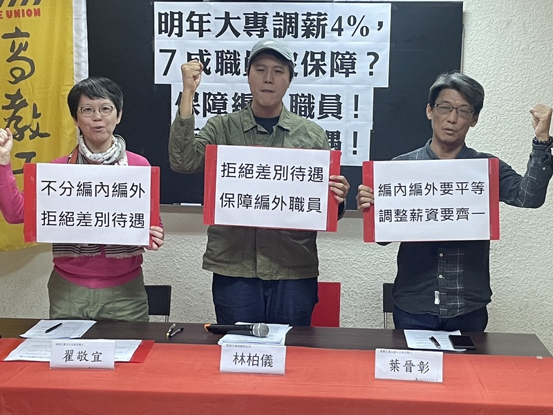 他更指出,政府近年都提供學校薪資與學費補助,包括近期私立大學的經費也獲得政府大力補助,但各校卻沒有將補助用來讓全體教職員薪資跟上標準。林柏儀也說,編制外職員薪資相對低,還無法獲得調薪的保障,令人感慨。