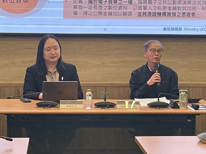 針對電子簽章或數位簽章是否用被駭客盜用的資安風險,唐鳳指出,現在數位身分驗證都是靠身分證正反面、視訊方式確認是本人,但當人工智慧進步,這些影片、照片都可以偽造,且還有身分證照片遭到冒用的狀況。