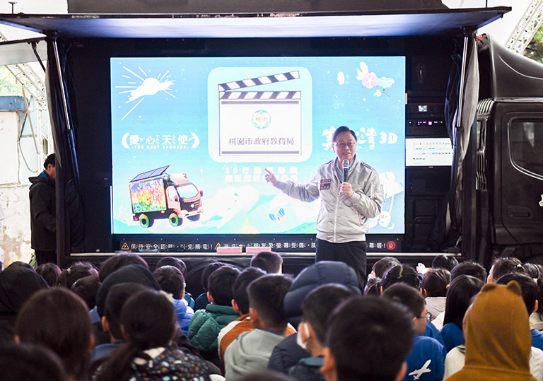 美力台灣3D行動電影院開進大園國小,桃園市長張善政期許學生透過電影賞析感受土地之美。(桃市府提供)