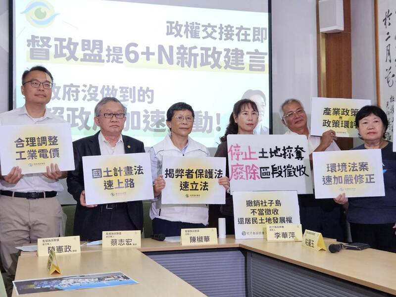 督政盟副召集人蔡志宏指出,氣候變遷加劇、台灣又是地震好發帶,政府不該放任國土遭到人為加劇開發、破壞,《國土計畫法》應儘速上路,並如期公告「縣市國土功能分區圖」,重新檢討國土發展計畫。另一位副召集人陳憲政說,政府應檢討長期工業電價的補貼,合理調整電價才能讓企業改善用電模式。