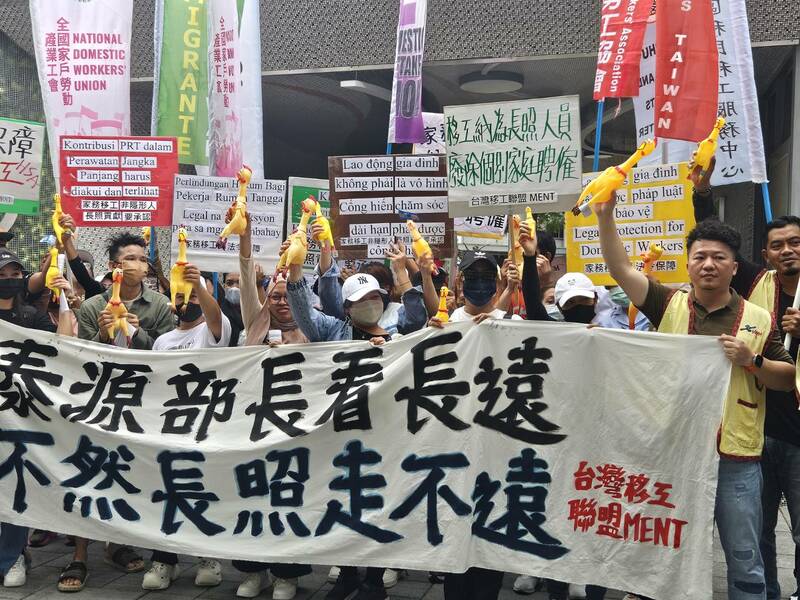 多位移工手舉看板、旗幟與尖叫雞玩偶,高喊「家務移工要法令保障」、「請泰元部長看長遠」、「不然長照走不遠」等口號。台灣國際勞工協會專員王俐婷表示,台灣自1992年引進移工後,在家庭看護移工方面刻意壓低家務移工的權益與薪水,移工還要24小時待命、很難休息且形同奴工。