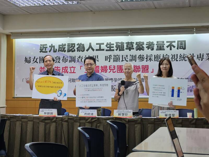 全國婦兒團體聯盟副召集人單信愛指出,婦團在今年8月5日至19日透過網路調查,蒐集到22縣市、2042筆樣本。據結果發現,87.7%民眾認為衛福部將送立法院審議的《人工生殖法》沒有完整考慮各面向,73.6%民眾不同意「代理孕母合法化」、73.4%民眾反對單身及同性伴侶可使用捐贈精卵人工生殖」。