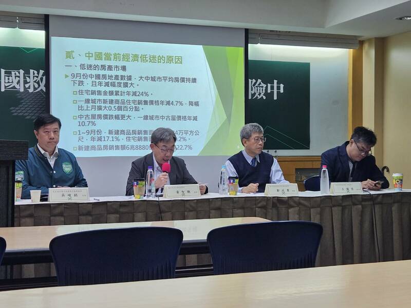民進黨中國部28日舉行「中國經濟風險座談會」。吳峻鋕表示,中國官方近來推出許多救市措施,包括減息、降準、提供再貸款額度等措施,但救市的成效不如預期,例如中國股市的ETF表現不佳、房市持續惡化、黃金周遊客消費力低、住房率不佳,還讓多國航空公司停飛中國航線,也反映在中國第三季經濟成長率4.6%、9月出口低於預期,外資正加速撤離中國。
