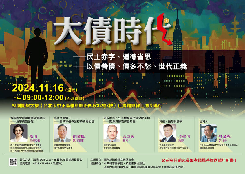 【台灣醒報記者呂翔禾台北報導】各國面臨債務氾濫,經濟前景充滿挑戰和隱憂,該如何因應?禧年經濟倫理文教基金會11月16日將舉行「大債時代」研討會,針對目前各國債務氾濫,以及金融財政的迷茫,對世代正義和道德之衝擊,進行研討。會中將邀請前新加坡霸菱亞太基金投資合夥人雷倩、政大財政系名譽教授曾巨威參與分享觀點。