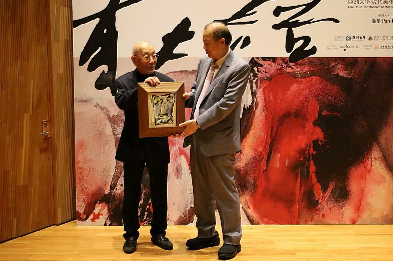「元氣•淋漓 – 90年莊喆特展」4日在亞洲大學現代美術館盛大開幕,展出旅美藝術家莊喆百幅作品。莊喆感念亞洲大學現代美術館,為他90歲之際,選在第二故鄉,為他籌畫展覧,意義非凡,他特別捐贈了12幅作品,盛情感人,讓蔡長海董事長與團隊,開心不已,昨天在開幕典禮中,舉行捐贈儀式,並回贈珍稀禮物。