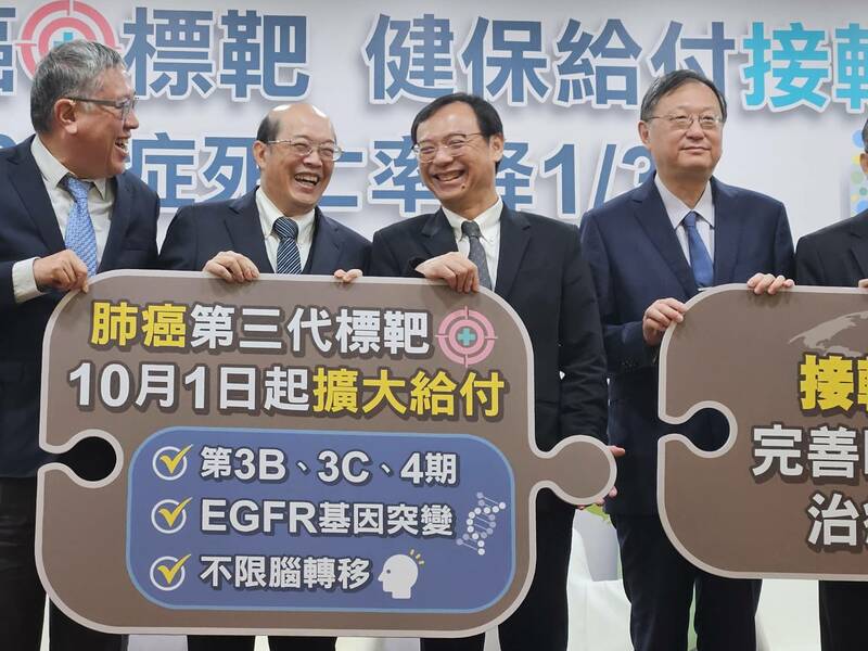 【台灣醒報記者呂翔禾台北報導】「盼透過第三代標靶藥物健保給付,降低晚期肺癌死亡率!」健保署長石崇良11日宣布,將開放第三代標靶藥物在肺癌第三期B、C階段,還有第四期使用,而且不限於腦轉移。癌症基金會執行長張文震表示,第三代標靶藥物有望將晚期肺癌存活率從13%拉高到20%以上;新竹台大分院院長余文忠也說,新藥物的副作用較小。