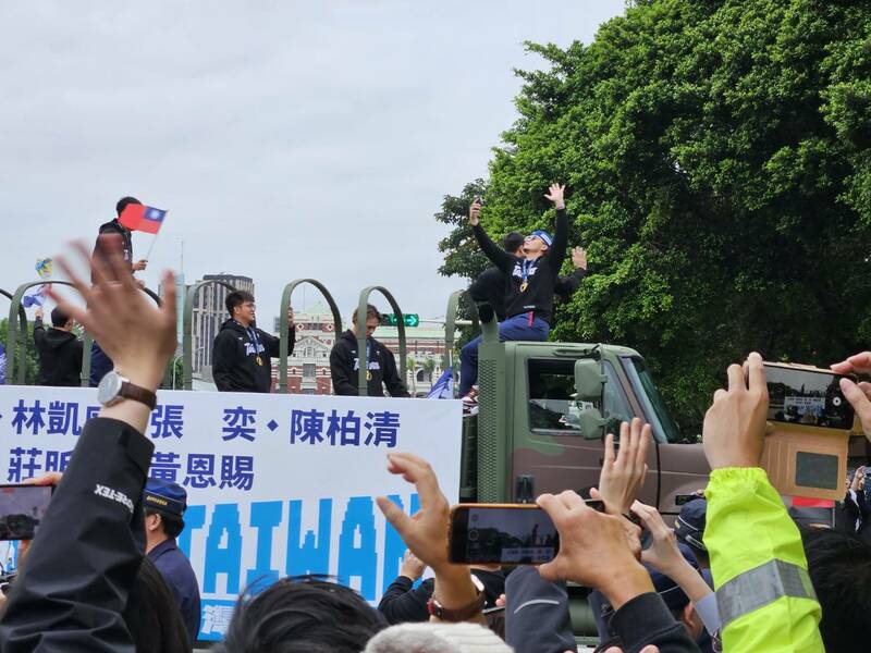 在12強冠軍慶祝遊行中,球員們身穿「Taiwan」的黑色球隊帽T,搭乘軍車接受國人祝福。許多球員也感到相當興奮,如投手林凱威便站在軍車頭開直播,捕手吉力吉撈‧鞏冠也特別站出來,跟球迷搖旗、打招呼。
