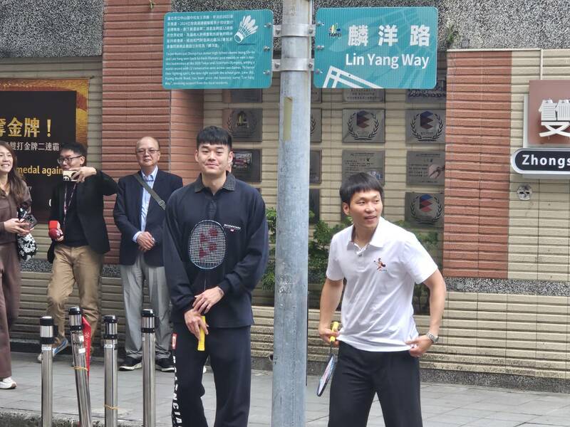 隨後兩人與蔣萬安便到外面的路牌合影,李洋與王齊麟還拿出球拍,在拍照時小秀羽球跳殺絕技,但距離沒掌握好讓球拍敲到路牌,兩人嚇到的模樣讓全場與會者都笑得很開心。