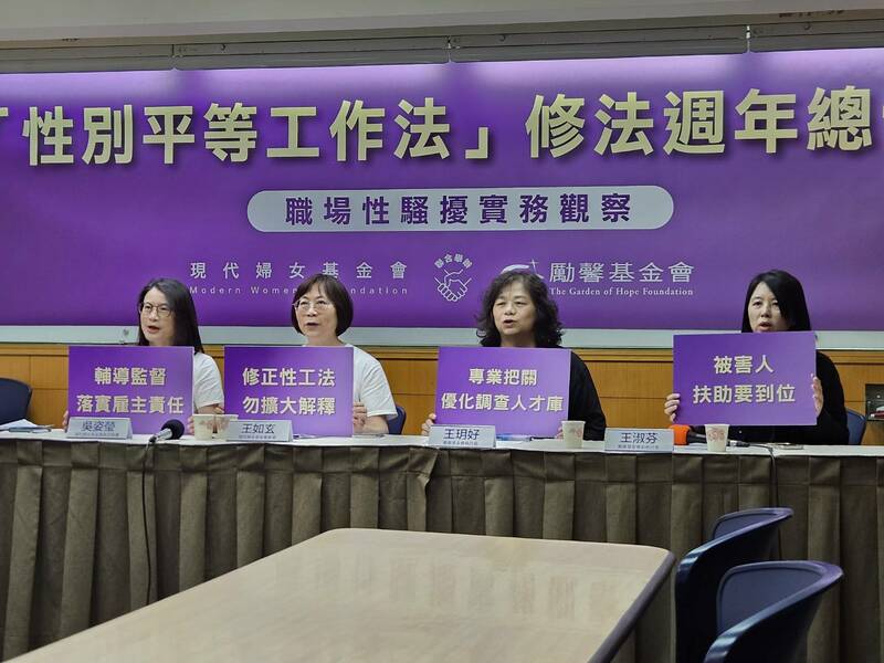 性平三法《性別平等教育法》、《性騷擾防治法》與《性別工作平等法》修正將屆滿1周年,現代婦女基金會與勵馨基金會等婦團6日召開記者會,檢討《性別工作平等法》落實狀況。