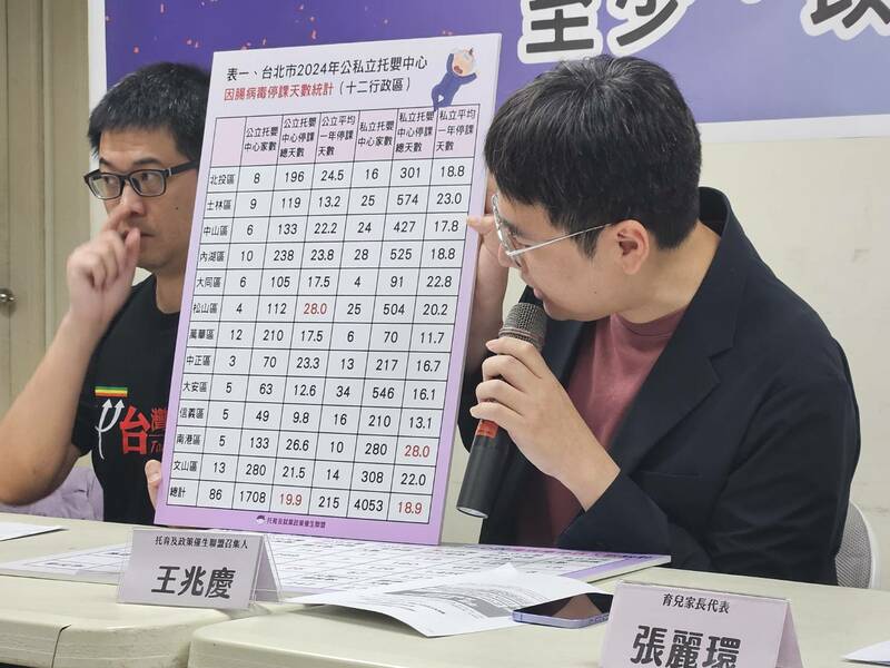 張姓家長代表也分享說,原本以為家裡小孩抽到公托很開心,但因為腸病毒停課,去年9月3日到9日停課後,13日又有疫情因此停課,整個9月幾乎都在停課下,育嬰假又要用「月」請,家裡的工作人口都需要貢獻休假,到最後媽媽乾脆請7個月育嬰假,但女性離開職場太久也不好,因此呼籲勞動部儘速研擬「日」為單位的育嬰假。