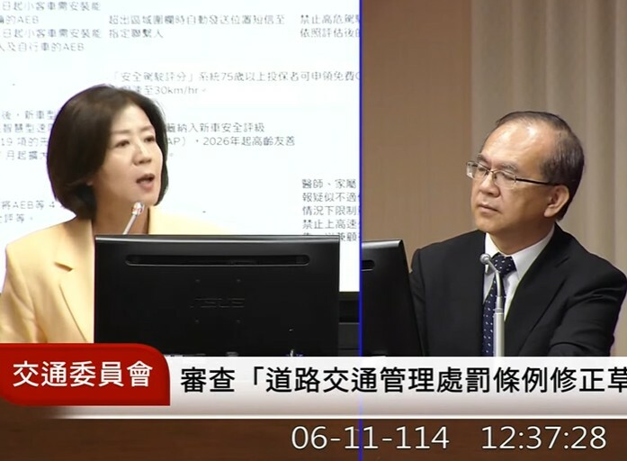 「台灣新車何時安裝自動緊急煞車系統?」王育敏表示,日本、南韓、歐盟與美國都有實施,陳彥伯回應說,117年的新車確定會依法進行安裝,既有車輛要等到119年,王育敏希望可以加速,但陳彥伯回應說,加裝相關設備牽涉車輛系統調整,若改太快可能貿然出問題。