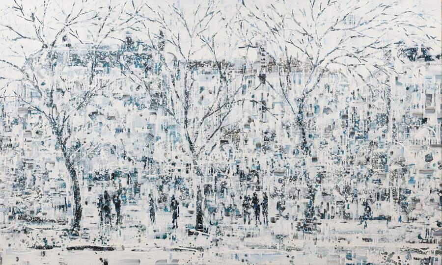 候機室的窗景、街邊公園的廣場、旅人絡繹不絕的車站,藝術家邱建仁以隨手記錄日常與旅行中的影像為基礎,透過複雜多樣的筆觸,創造了一個關於城市、記憶與流動身體的對話領域。畫布中潑灑奔流的顏料堆疊出時而破碎時而交連的複雜肌理,讓影像敘事不再只是決定性的瞬間(Images à laSauvette),更是反映了觀者匯流其中的思緒片斷與豐沛情感。