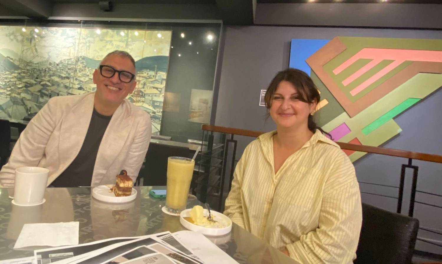 山姆.巴塔維爾(Sam Bardaouil)帶著助理茱莉亞•巴達爾揚(Julia badaljan),到「典藏-長安咖啡店」,他們簡單喝著飲料,分享對台灣的微妙情緣,同時,也希望公開追募10萬歐元(約新台幣350萬元),讓策展心、台灣情,更淋漓盡致。(作者提供)