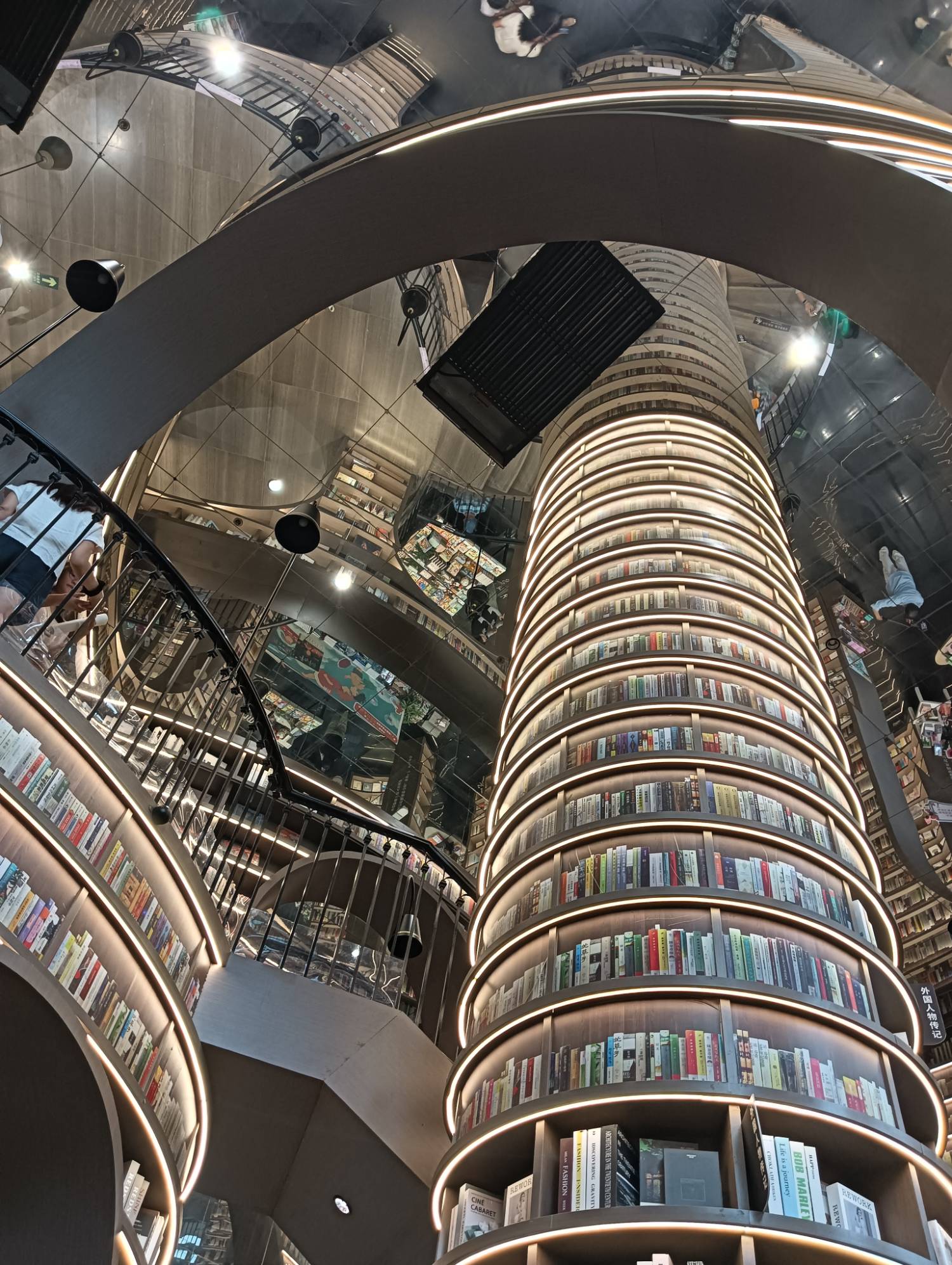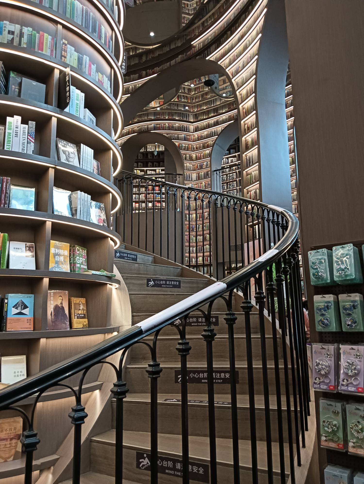 而高聳入雲的書架,引入的是水壩意象,如同以書構成的一座座高大水壩。沿著螺旋梯往上走,俯看之餘,又是另一種感受,可看到一個個陳列書籍的展示台,設計為扁舟形狀,彷彿他們正靜靜地停泊在水波蕩漾之間,等待與愛書人相遇。當然,高到頂端的書架上的書,僅是裝飾而已。