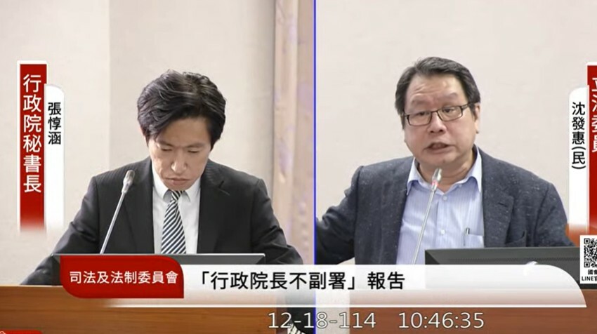 針對115年總預算,張惇涵也喊話說,若不通過,各縣市的T-PASS、治水與藥物韌性預算恐受到影響。民進黨立委沈發惠則追問,不副署是否有獨裁?張惇涵回應說,立法院還有倒閣權,並非窮盡憲政救濟手段,因此沒有「行政獨裁」的問題。
