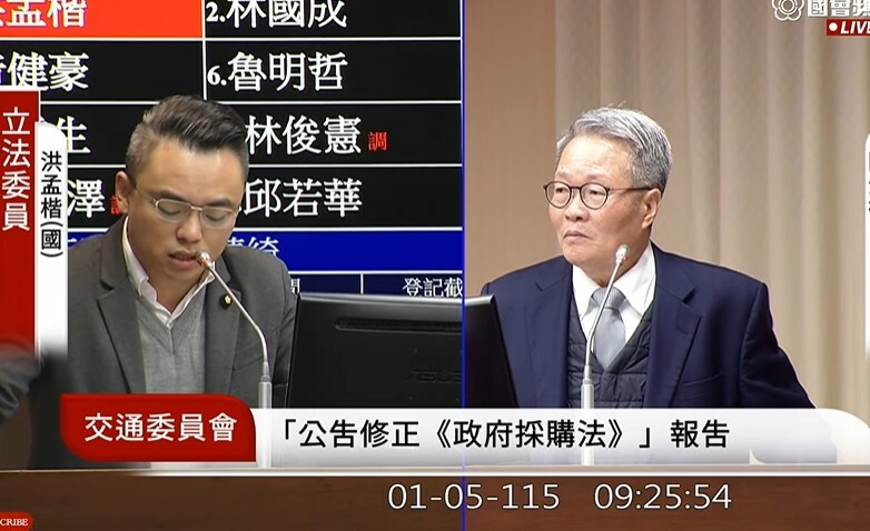 「大案子更不能放寬標準!」洪孟楷表示,重大公共工程案件雖然相對少,但更需要過去有實績的廠商,建議不要放寬限制。對此,陳金德回應說,工程會將更廣泛參酌各方意見。洪孟楷接著追問,國防預算從2016年的3千億大增到115年的9千億,但如今標案爭議卻頻傳,工程會應該確保接案廠商之專業。
