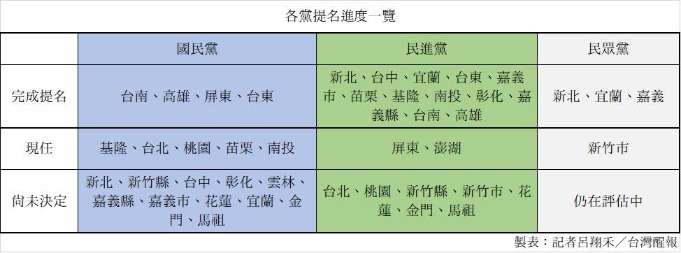 相較民進黨的快速提名,國民黨目前提名仍在多方協調階段,由於新北、台中、宜蘭、新竹縣、花蓮縣、嘉義市等地的國民黨縣市長都任期屆滿,雖然民眾黨也有提名人選,但國民黨光是黨內就喬不定,包括新北有副市長劉和然與台北市副市長李四川角逐,台中則有立法院副院長江啓臣與資深立委楊瓊瓔爭鋒。