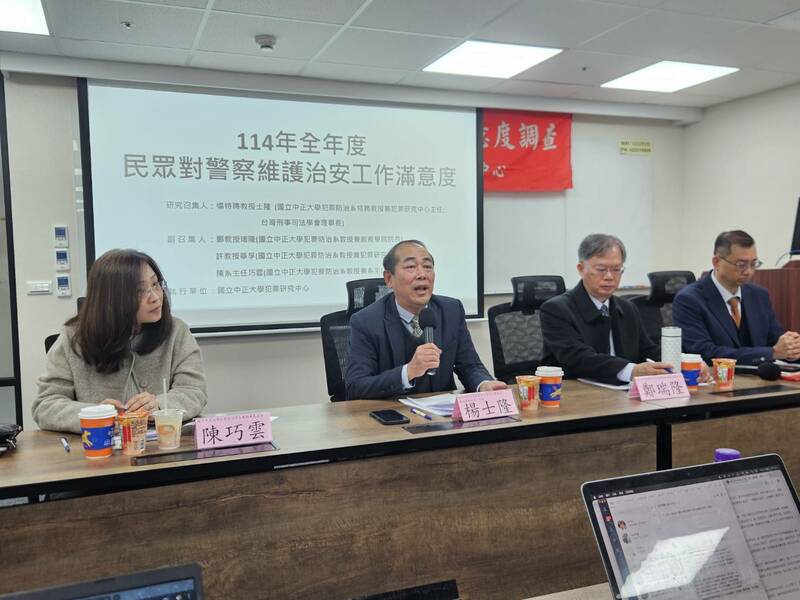中正大學犯罪防治學系21日公布「114年民眾對警察重點施政作為之滿意度」調查,結果顯示僅48.56%對整體治安感到滿意,但對於住家與社區治安的滿意度有86.35%,對警察維持治安滿意度78.72%、處理案件的態度82.28%,比去年的74.18%有顯著的提升,對於打詐的滿意度則有64.99%。